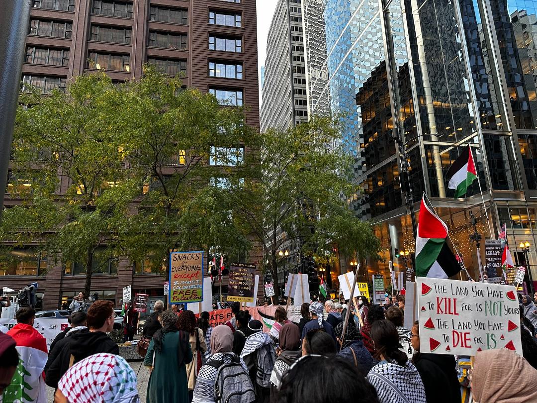 إلينوي 2-10-2024 وفا- اعتصم المئات من النشطاء والمناصرين للحقوق الفلسطينية، وأعضاء منظمات مجتمعية أمام القنصلية الإسرائيلية في مدينة شيكاغو بولاية إلينوي للمطالبة بإيقاف الاحتلال الإبادة الجماعية في قطاع غزة وإنهاء العدوان الهمجي على لبنان.