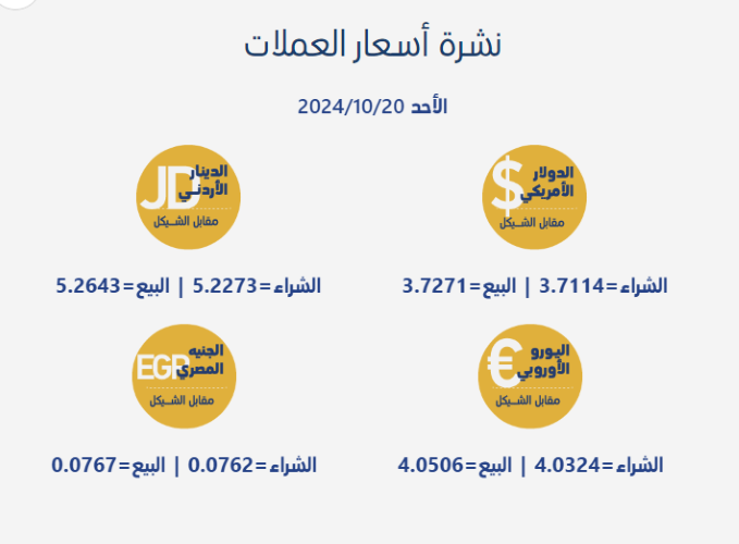 رام الله 20-10-2024 وفا- جاءت أسعار صرف العملات مقابل الشيقل الإسرائيلي، اليوم الأحد، بحسب سلطة النقد الفلسطينية، على النحو التالي: