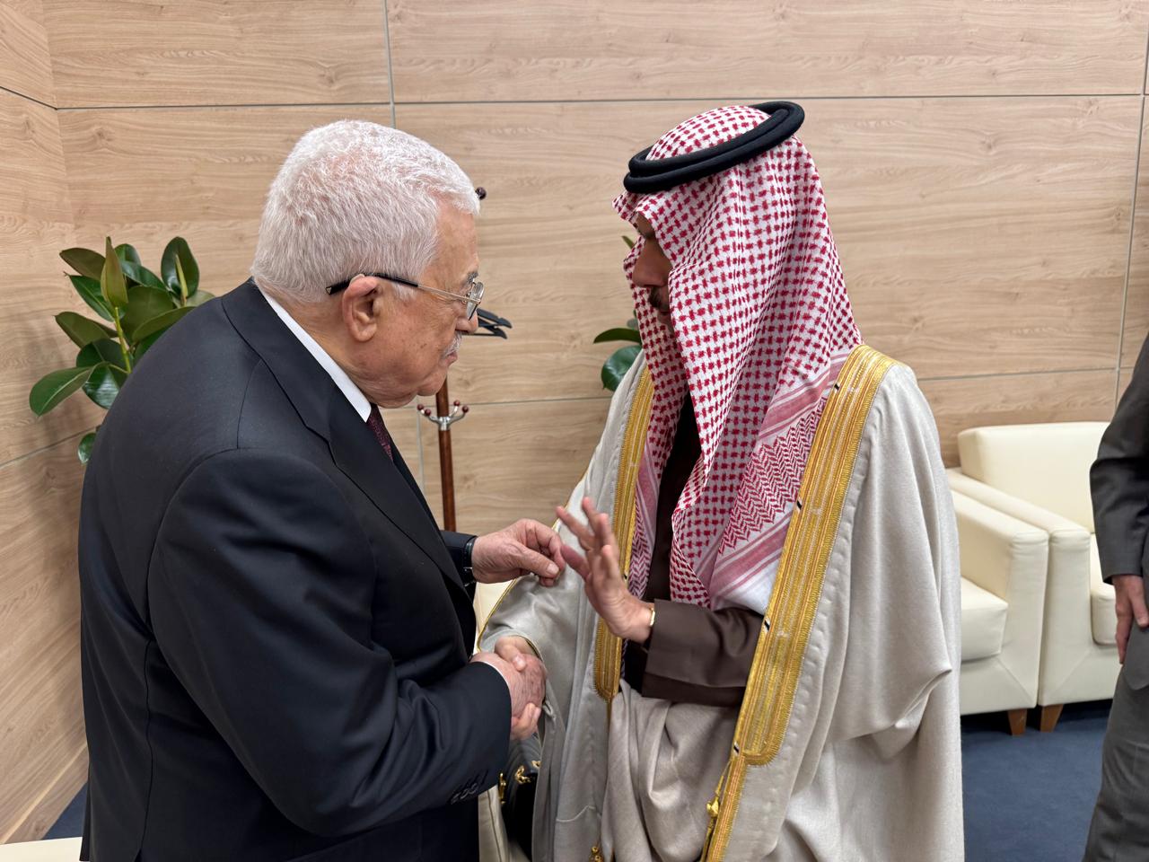 وطلب سيادته خلال لقائه الوزير بن فرحان، بنقل تحياته إلى خادم الحرمين الشريفين الملك سلمان بن عبد العزيز آل سعود، وولي عهده، الأمير محمد بن سلمان، مثمنا مواقف المملكة العربية السعودية المبدئية والثابتة تجاه دعم الشعب الفلسطيني وقضيته العادلة على الصعد كافة، وخاصة في المحافل الدولية من خلال ترؤسها للجنة العربية-الإسلامية، لحشد الدعم الدولي، للحصول على مزيد من الاعترافات بالدولة الفلسطينية، والحصول على العضوية الكاملة في الأمم المتحدة.