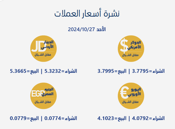 رام الله 27-10-2024 وفا- جاءت أسعار صرف العملات مقابل الشيقل الإسرائيلي، اليوم الأحد، بحسب سلطة النقد الفلسطينية، على النحو التالي: