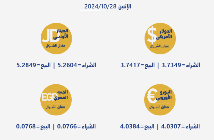 رام الله 28-10-2024 وفا- جاءت أسعار صرف العملات مقابل الشيقل الإسرائيلي، اليوم الإثنين، بحسب سلطة النقد الفلسطينية، على النحو التالي: