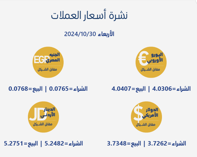 رام الله 30-10-2024 وفا- جاءت أسعار صرف العملات مقابل الشيقل الإسرائيلي، اليوم الأربعاء، بحسب سلطة النقد الفلسطينية، على النحو التالي: