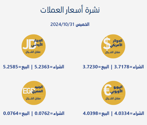 رام الله 31-10-2024 وفا- جاءت أسعار صرف العملات مقابل الشيقل الإسرائيلي، اليوم الخميس، بحسب سلطة النقد الفلسطينية، على النحو التالي:
