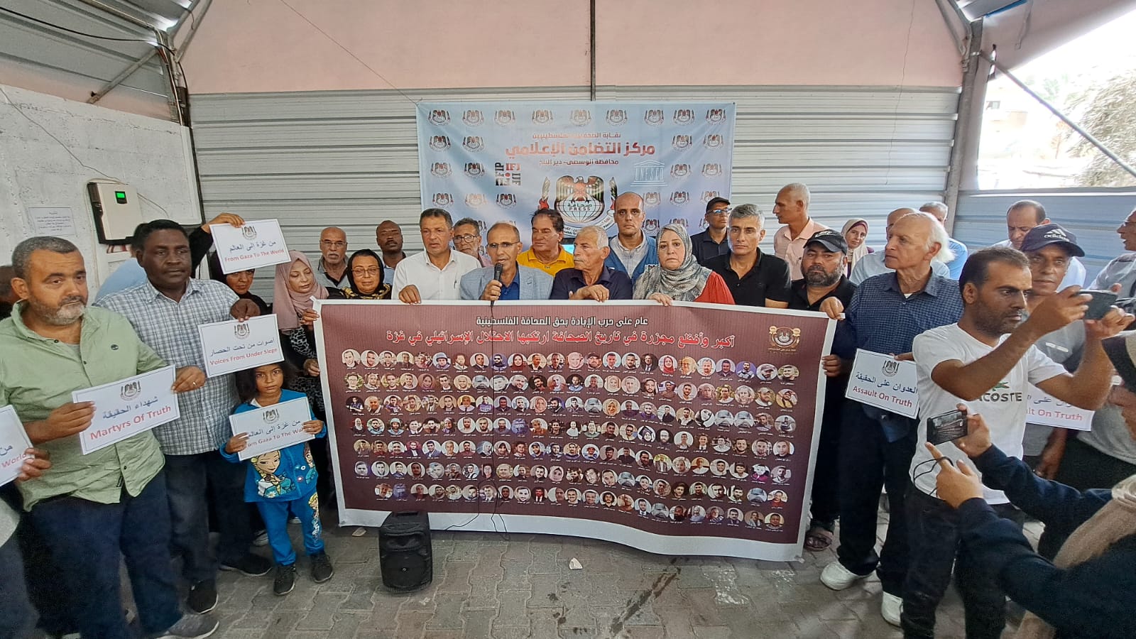 ووجه شكره باسم مجموع الصحفيين الفلسطينيين لمنظمة اليونسكو على تمويلها لمركز التضامن الإعلامي - دير البلح، مضيفا أن جائزة اليونسكو التي حصلت عليها النقابة نيابة عن صحفيين قطاع غزة هي وسام شرف على صدر كل صحفيي فلسطين، خاصة أن هذا الوسام دفعت من أجله الأرواح والدماء.