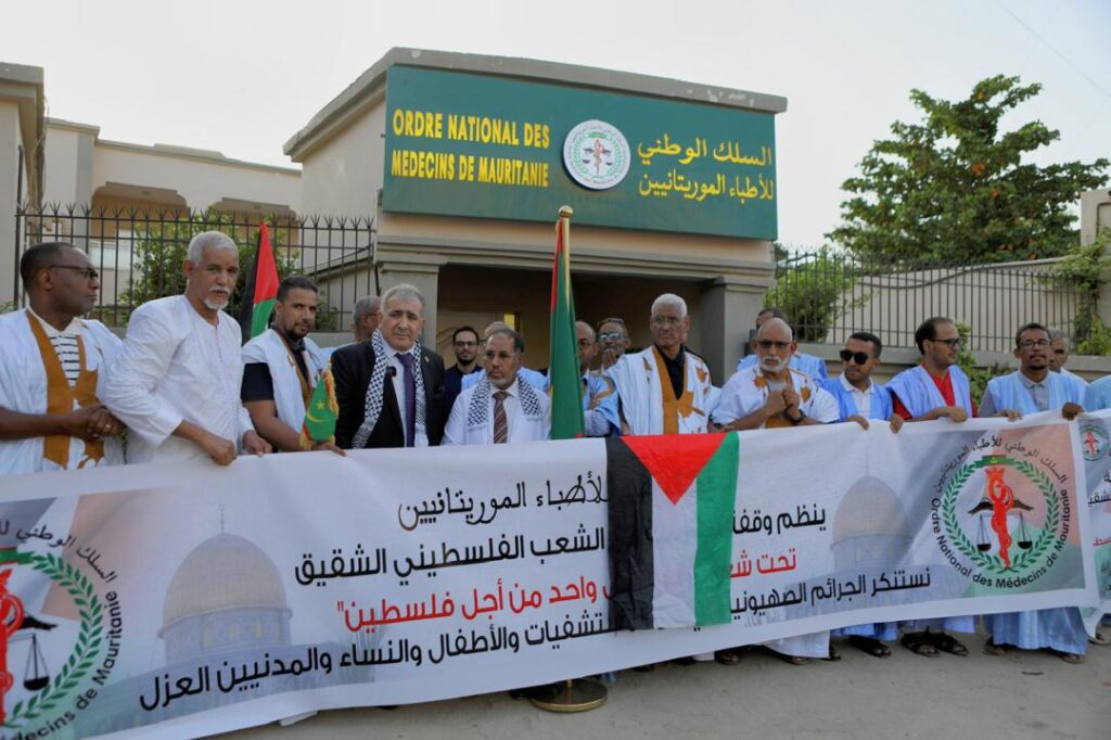 نواكشوط 8-10-2024 وفا- نظم السلك الوطني للأطباء الموريتانيين، اليوم الثلاثاء، وقفة احتجاجية أمام مقره في العاصمة نواكشوط، "أدان فيها الإبادة التي يتعرض لها الأبرياء على يد قوات الاحتلال الإسرائيلي في غزة ولبنان".