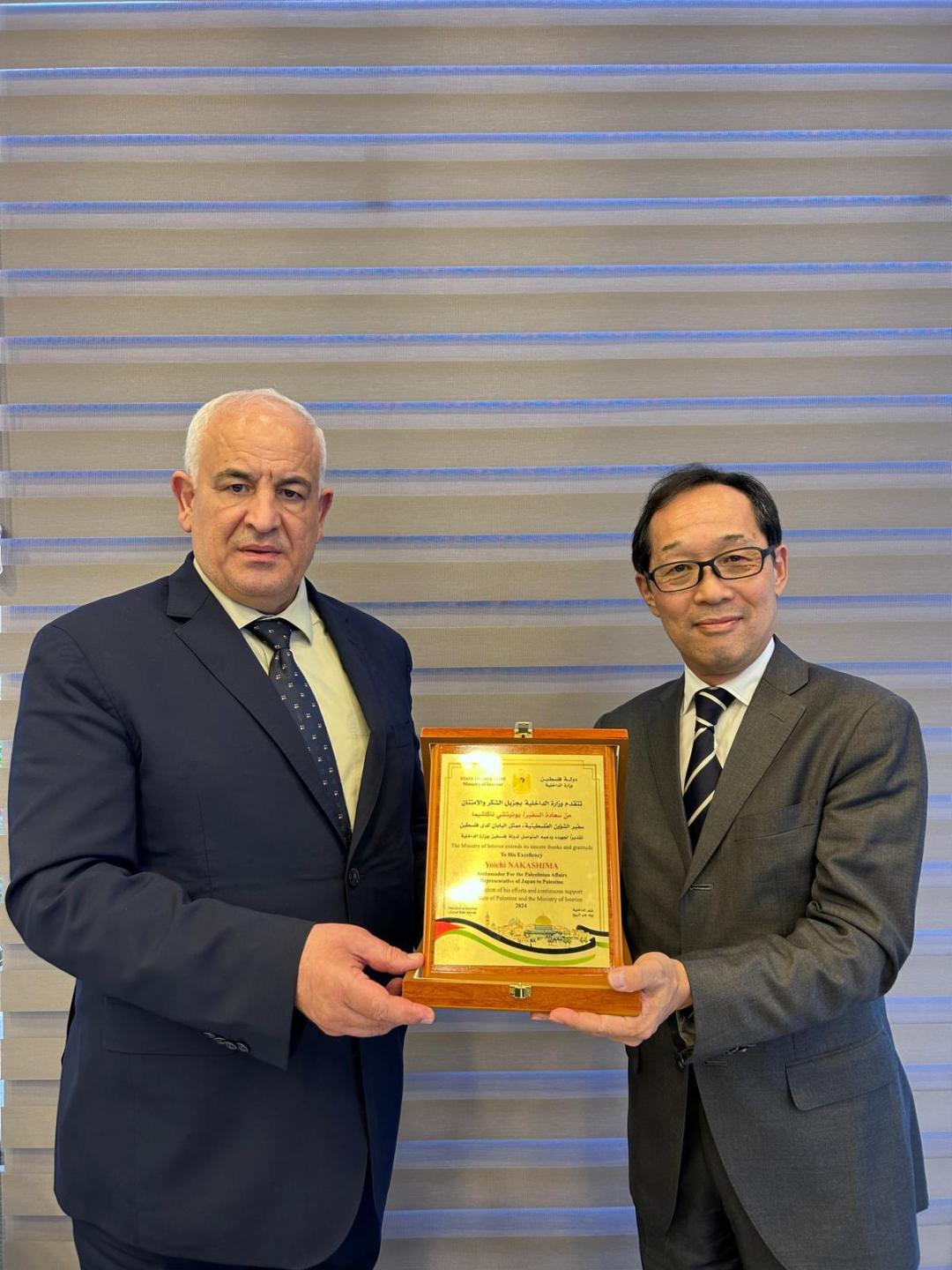 رام الله 10-11-2024 وفا- كرّم وزير الداخلية اللواء زياد هب الريح، اليوم الأحد، السفير الياباني لدى دولة فلسطين، يوئيتشي ناكاشيما، لمناسبة انتهاء مهامه الرسمية.