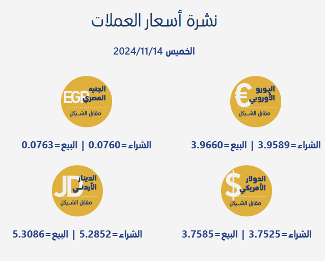 رام الله 14-11-2024 وفا- جاءت أسعار صرف العملات مقابل الشيقل الإسرائيلي، اليوم الخميس، بحسب سلطة النقد الفلسطينية، على النحو التالي: