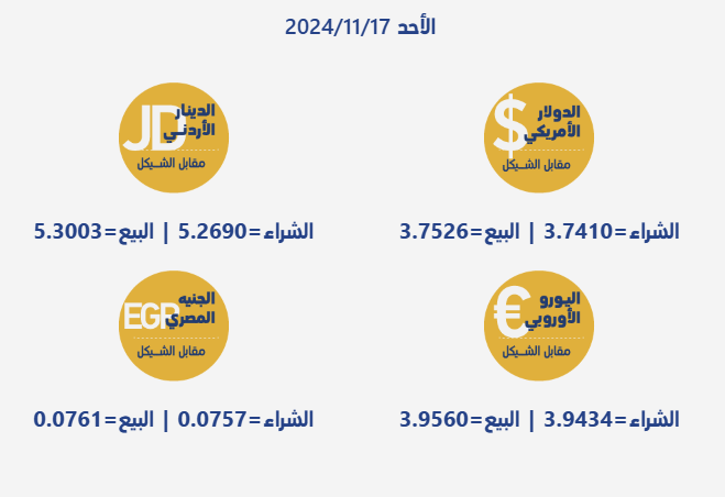رام الله 17-11-2024 وفا- جاءت أسعار صرف العملات مقابل الشيقل الإسرائيلي، اليوم الأحد، بحسب سلطة النقد الفلسطينية، على النحو التالي: