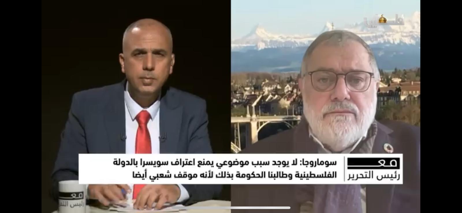 وقال سوماروجا في حديث لبرنامج "مع رئيس التحرير" الذي يبث عبر تلفزيون فلسطين:" إن اللوبي الإسرائيلي له تأثير على البرلمان السويسري، إلا أن المؤيدين والداعمين للقضية الفلسطينية في البرلمان يطالبون الحكومة دائماً بضرورة احترام القانون الدولي، وقرارات الأمم المتحدة.