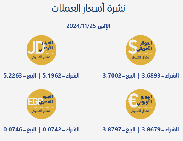 رام الله 25-11-2024 وفا- جاءت أسعار صرف العملات مقابل الشيقل الإسرائيلي، اليوم الاثنين، بحسب سلطة النقد الفلسطينية، على النحو التالي: