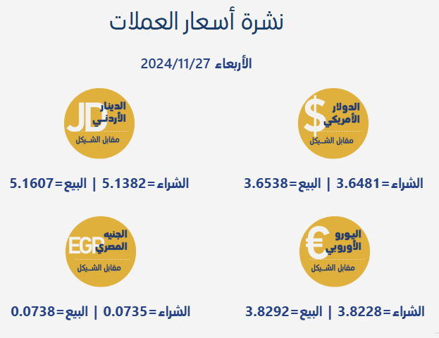 رام الله 27-11-2024 وفا- جاءت أسعار صرف العملات مقابل الشيقل الإسرائيلي، اليوم الأربعاء، بحسب سلطة النقد الفلسطينية، على النحو التالي: