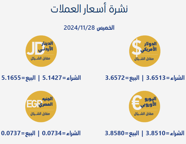 رام الله 28-11-2024 وفا- جاءت أسعار صرف العملات مقابل الشيقل الإسرائيلي، اليوم الخميس، بحسب سلطة النقد الفلسطينية، على النحو التالي: