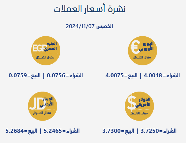 رام الله 7-11-2024 وفا- جاءت أسعار صرف العملات مقابل الشيقل الإسرائيلي، اليوم الخميس، بحسب سلطة النقد الفلسطينية، على النحو التالي:
