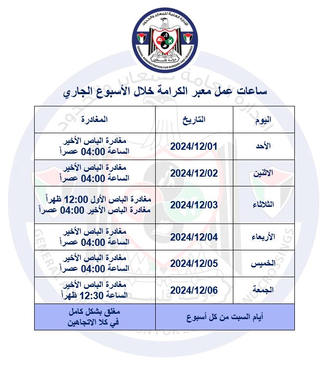 أريحا 1-12-2024 وفا- أعلنت الإدارة العامة للمعابر والحدود، اليوم الأحد، ساعات عمل معبر الكرامة (جسر الملك حسين) خلال الأسبوع الجاري.