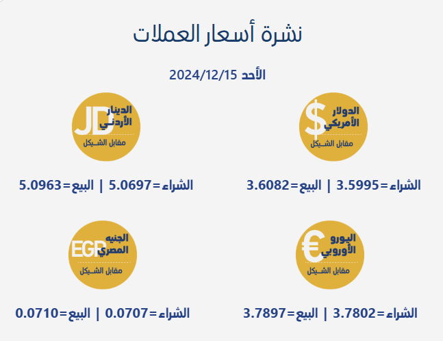 رام الله 15-12-2024 وفا- جاءت أسعار صرف العملات مقابل الشيقل، اليوم الأحد، بحسب سلطة النقد الفلسطينية، على النحو التالي: