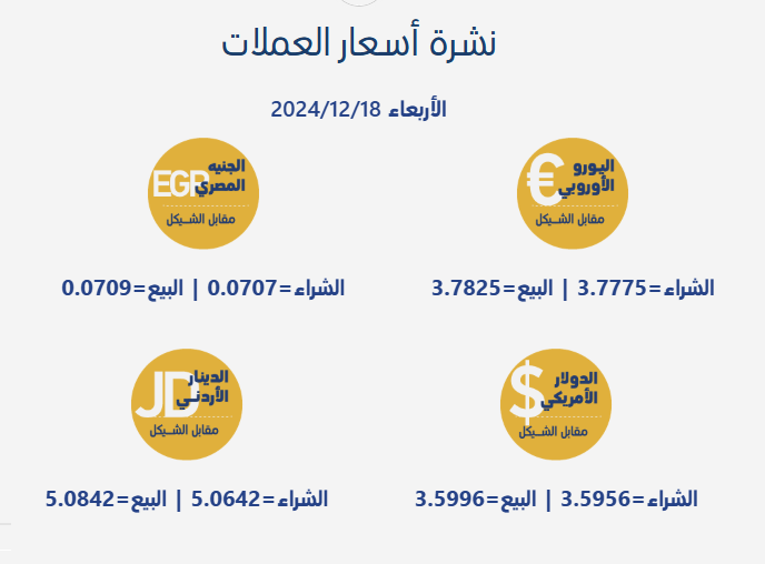رام الله 18-12-2024 وفا- جاءت أسعار صرف العملات مقابل الشيقل الإسرائيلي، اليوم الأربعاء، بحسب سلطة النقد الفلسطينية، على النحو التالي: