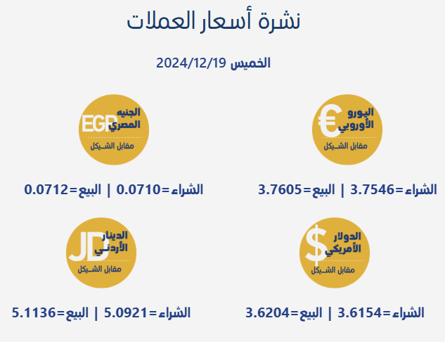 رام الله 19-12-2024 وفا- جاءت أسعار صرف العملات مقابل الشيقل الإسرائيلي، اليوم الخميس، بحسب سلطة النقد الفلسطينية، على النحو التالي: