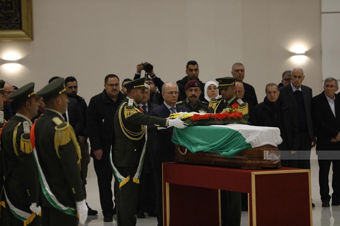 وألقى المشاركون نظرة الوداع الأخيرة على جثمانه وقرأوا الفاتحة في قاعة أحمد الشقيري بمقر الرئاسة، ووضع مصطفى إكليلا من الزهور على نعشه، قبل أن ينطلق الموكب باتجاه مسجد العين في مدينة البيرة، حيث ستقام صلاة الجنازة على جثمان الفقيد بعد صلاة الجمعة، ومن ثم إلى مقبرة البيرة القديمة لمواراة جثمانه الثرى.