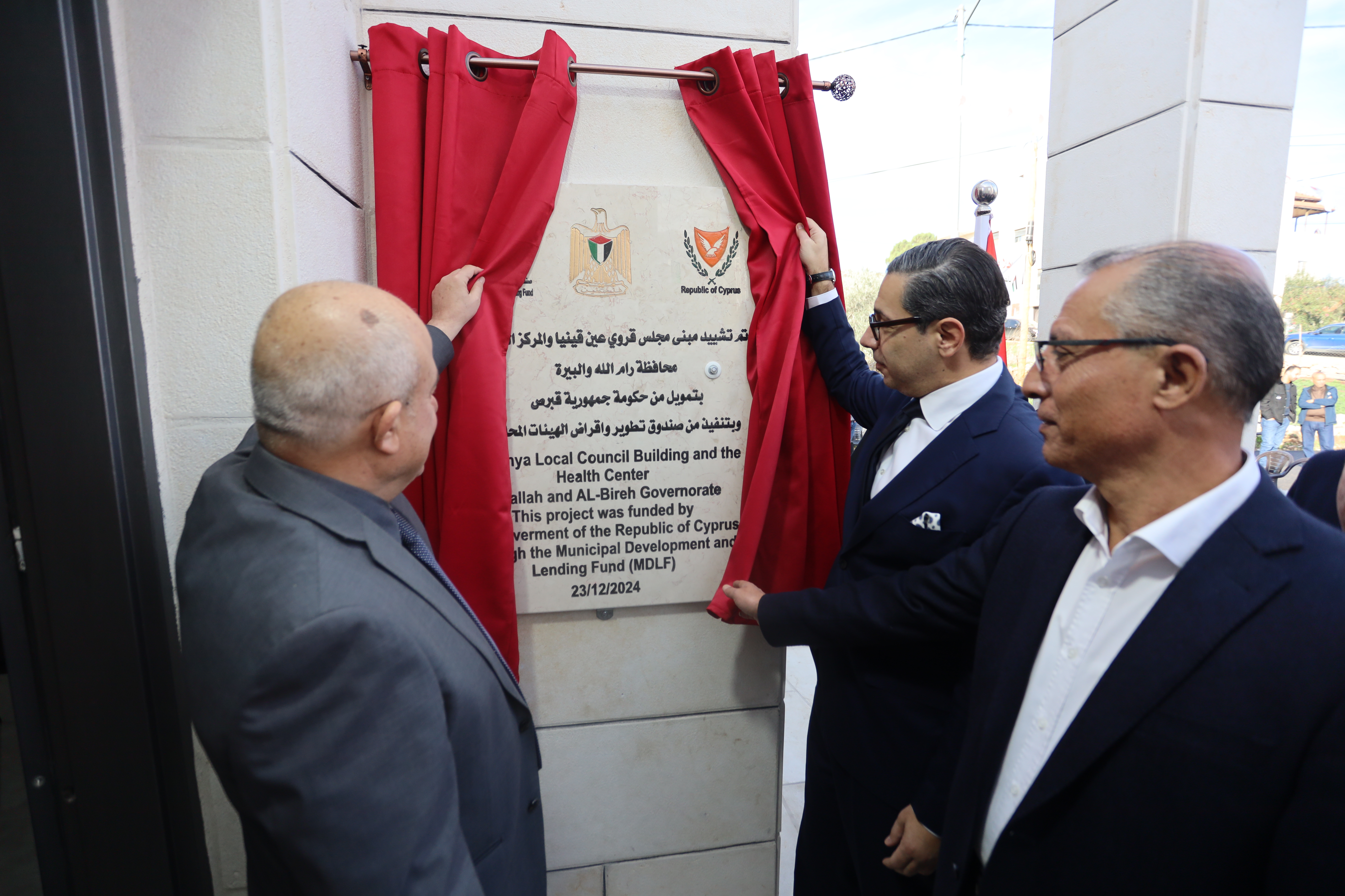 رام الله 23-12-2024 وفا- افتتح وزير الحكم المحلي سامي حجاوي، ووزير خارجية جمهورية قبرص كونستانتينوس كومبوس، اليوم الاثنين، مشروع مبنى مجلس قروي عين قينيا، والمركز الصحي، بقيمة قرابة مليون شيقل.