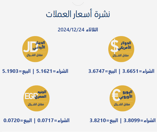 رام الله 24-12-2024 وفا- جاءت أسعار صرف العملات مقابل الشيقل الإسرائيلي، اليوم الثلاثاء، بحسب سلطة النقد الفلسطينية، على النحو التالي: