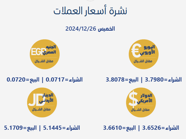 رام الله 26-12-2024 وفا- جاءت أسعار صرف العملات مقابل الشيقل الإسرائيلي، اليوم الخميس، بحسب سلطة النقد الفلسطينية، على النحو التالي:
