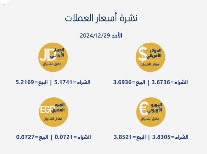 رام الله 29-12-2024 وفا- جاءت أسعار صرف العملات مقابل الشيقل الإسرائيلي، اليوم الأحد، بحسب سلطة النقد الفلسطينية، على النحو التالي: