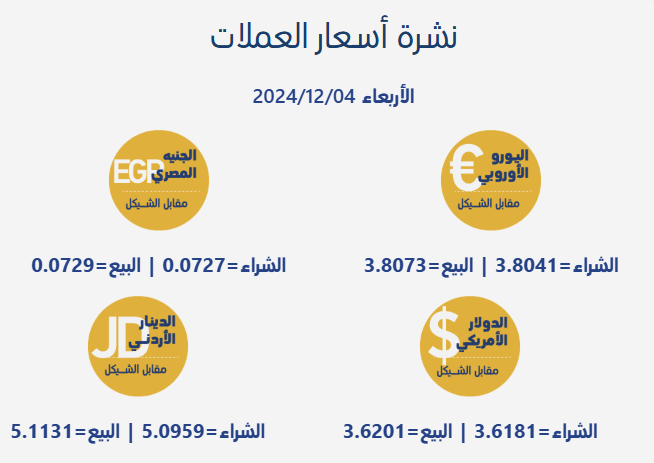 رام الله 4-12-2024 وفا- جاءت أسعار صرف العملات مقابل الشيقل الإسرائيلي، اليوم الأربعاء، بحسب سلطة النقد الفلسطينية، على النحو التالي: