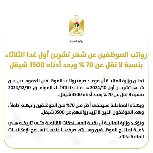 رام الله 9-12-2024 وفا- أعلنت وزارة المالية أن موعد صرف رواتب الموظفين العموميين عن شهر تشرين الأول 2024، هو يوم غد الثلاثاء، بنسبة لا تقل عن 70% وبحد أدناه 3500 شيقل.