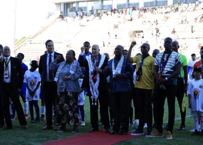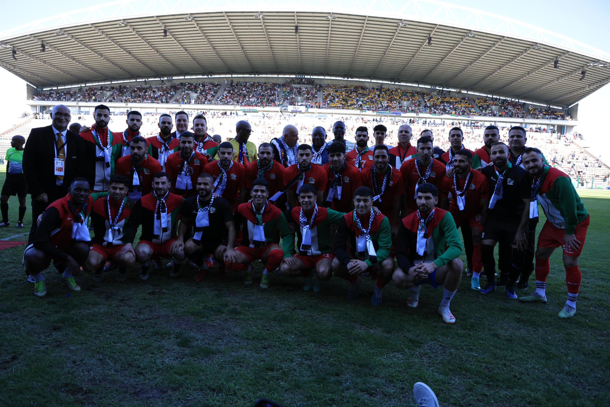 وقبل انطلاق اللقاء الذي جرى "من أجل الإنسانية" تحت شعار "السلام والأمل والتضامن، قام الرئيس رامافوزا الذي توشح بالكوفية الفلسطينية، والرجوب، وعدد من الشخصيات بالتسليم على لاعبي المنتخبين والتقاط الصور التذكارية.