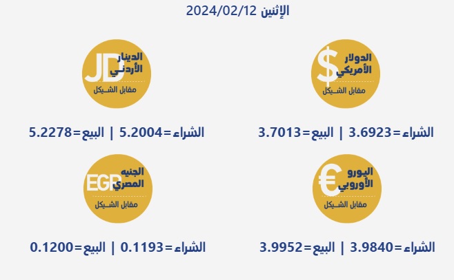 رام الله 12-2-2024 وفا- جاءت أسعار صرف العملات مقابل الشيقل الإسرائيلي، اليوم الإثنين، بحسب سلطة النقد الفلسطينية، على النحو التالي: