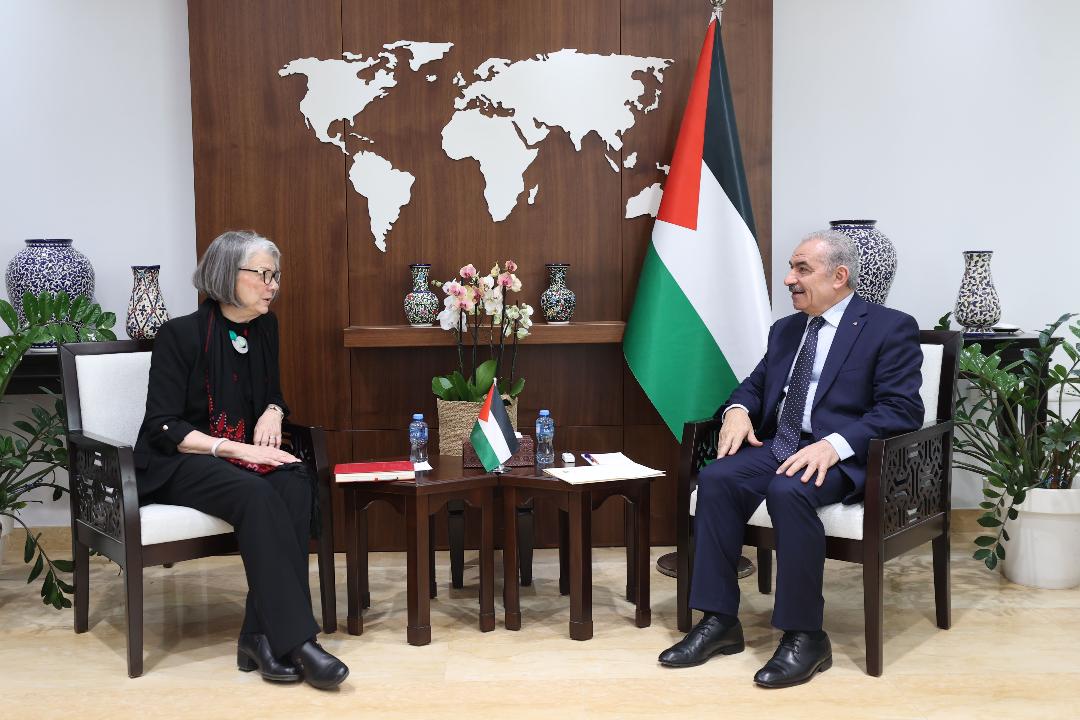 رام الله 13-2-2024 وفا- بحث رئيس الوزراء محمد اشتية، اليوم الثلاثاء، مع رئيسة الاتحاد الدولي لجمعيات الصليب الأحمر والهلال الأحمر، كيت فوربس، تعزيز الجهود الإغاثية لتخفيف تداعيات عدوان الاحتلال وحرب الإبادة على شعبنا.