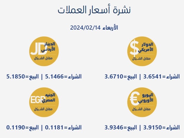 رام الله 14-2-2024 وفا- جاءت أسعار صرف العملات مقابل الشيقل الإسرائيلي، اليوم الأربعاء، بحسب سلطة النقد الفلسطينية، على النحو التالي: