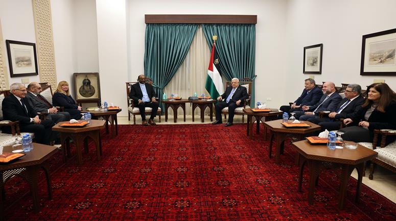 رام الله 19-2-2024 وفا- استقبل رئيس دولة فلسطين محمود عباس، اليوم الاثنين، بمقر الرئاسة في مدينة رام الله، أمين عام مجلس الكنائس العالمي البروفيسور القس جيري بيلاي، والوفد المرافق له، بحضور رئيس اللجنة الرئاسية العليا لشؤون الكنائس رمزي خوري.