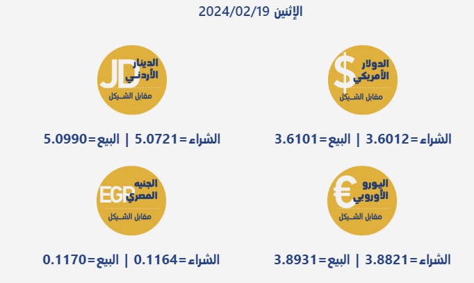 رام الله 19-2-2024 وفا- جاءت أسعار صرف العملات مقابل الشيقل الإسرائيلي، اليوم الإثنين، بحسب سلطة النقد الفلسطينية، على النحو التالي: