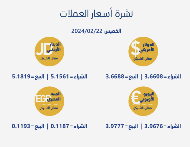 رام الله 22-2-2024 وفا- جاءت أسعار صرف العملات مقابل الشيقل الإسرائيلي، اليوم الخميس، بحسب سلطة النقد الفلسطينية، على النحو التالي: