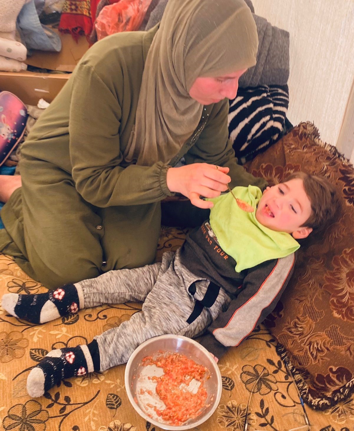 فرغت الأم "حياة الرضيع" من هرس حبة طماطم ناضجة مع كسرة خبز وأخذت تطعم طفلها، من ذوي الإعاقة، محمد الذي يبلغ من العمر عامين ونصف.