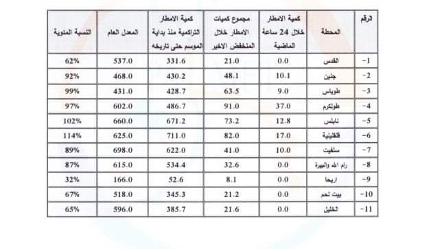 وأضاف، أن مدينة قلقيلية سجلت أعلى مجموع مطري منذ بداية الموسم، حيث بلغت كميات الأمطار التراكمية 711.0 ملم، وهو ما يشكل ما نسبته 114% من المعدل السنوي العام، وتتراوح نسبة هطول الأمطار في بقية المناطق الشمالية والوسطى ما بين 87-102%، بينما في المناطق الجنوبية تراوحت كميات الأمطار الهاطلة ما بين 62-67%، وسجلت مدينة أريحا أقل كمية أمطار منذ بداية الموسم حيث بلغت 52.6 ملم، وهو ما يشكل ما نسبته 32% من المعدل السنوي العام.