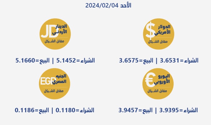رام الله 4-2-2024 وفا- جاءت أسعار صرف العملات مقابل الشيقل الإسرائيلي، اليوم الأحد، بحسب سلطة النقد الفلسطينية، على النحو التالي: