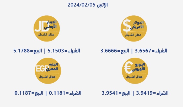 رام الله 5-2-2024 وفا- جاءت أسعار صرف العملات مقابل الشيقل الإسرائيلي، اليوم الإثنين، بحسب سلطة النقد الفلسطينية، على النحو التالي: