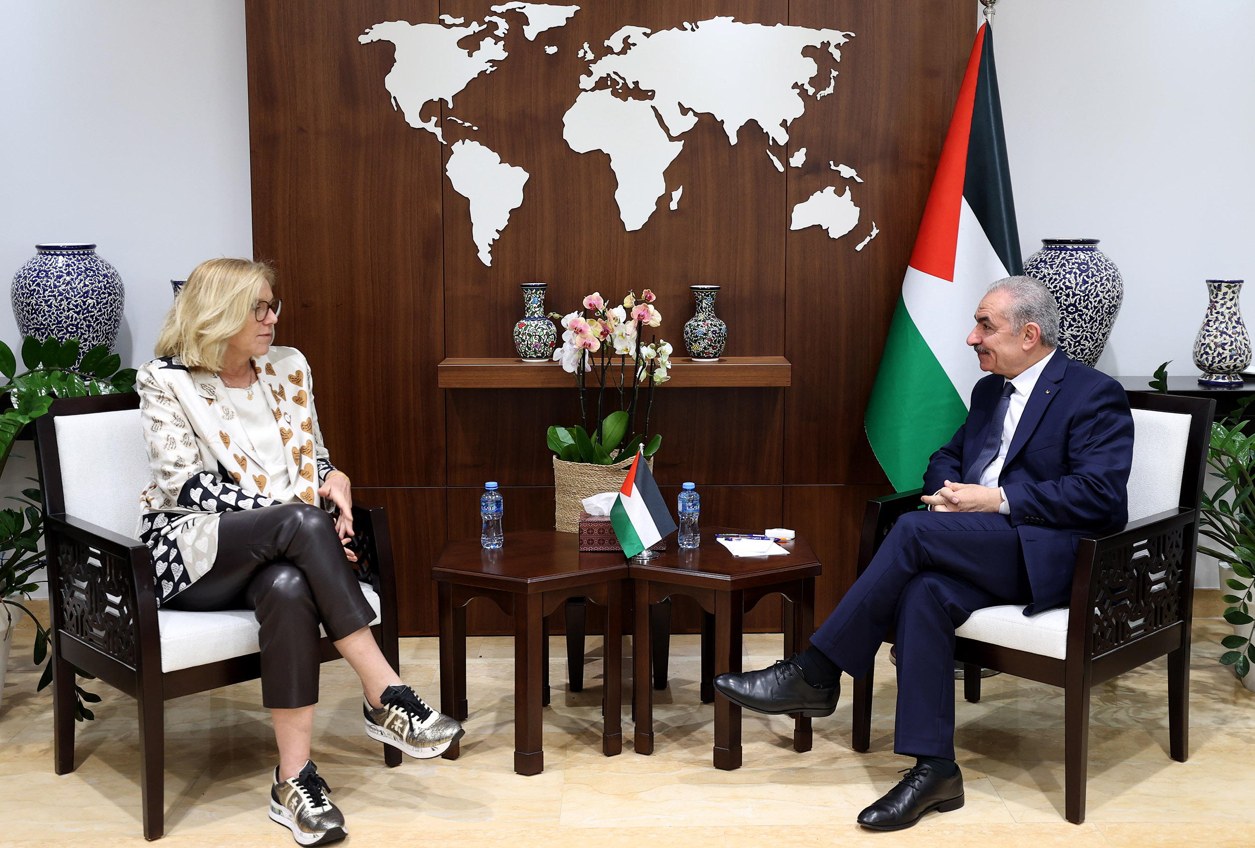 رام الله 8-2-2024 وفا- بحث رئيس الوزراء محمد اشتية، مع كبيرة منسقي الأمم المتحدة للشؤون الإنسانية وإعادة الإعمار في غزة سيغريد كاغ، سبل زيادة إدخال المساعدات إلى القطاع من المعابر كافة، وضمان وصولها إلى جميع أنحاء غزة.