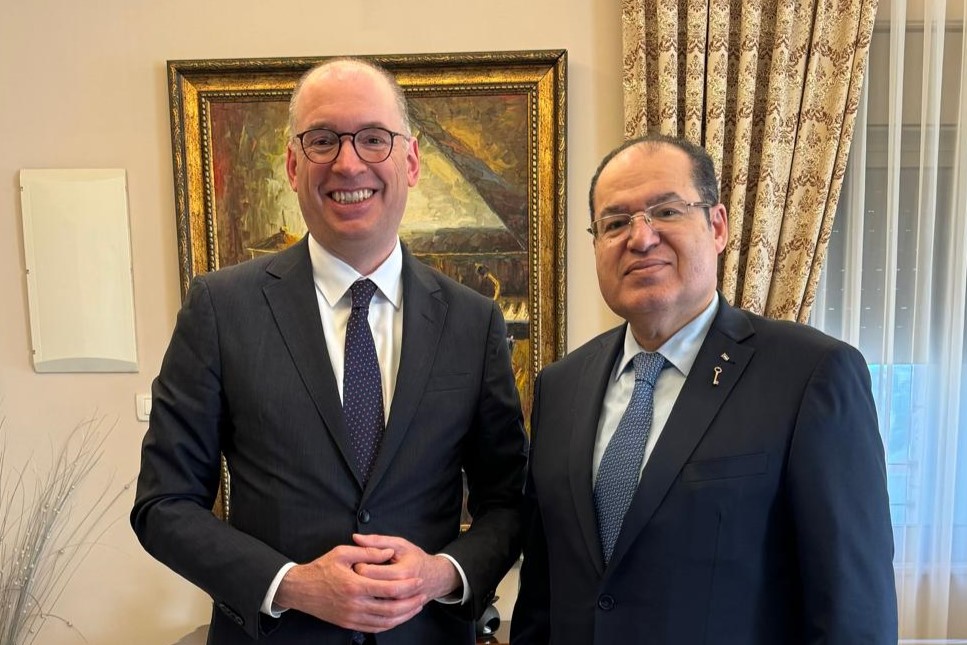 رام الله 26-3-2024 وفا- استقبل مستشار الرئيس للشؤون الدبلوماسية مجدي الخالدي، اليوم الثلاثاء، وزير الدولة الألماني للتعاون الاقتصادي والتنمية نيلز أنين.
