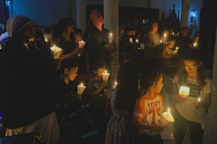 وأضاء المصلون الشموع، ورفعوا الصلوات ورنموا من أجل السلام، على وقع استمرار القصف الإسرائيلي على القطاع.