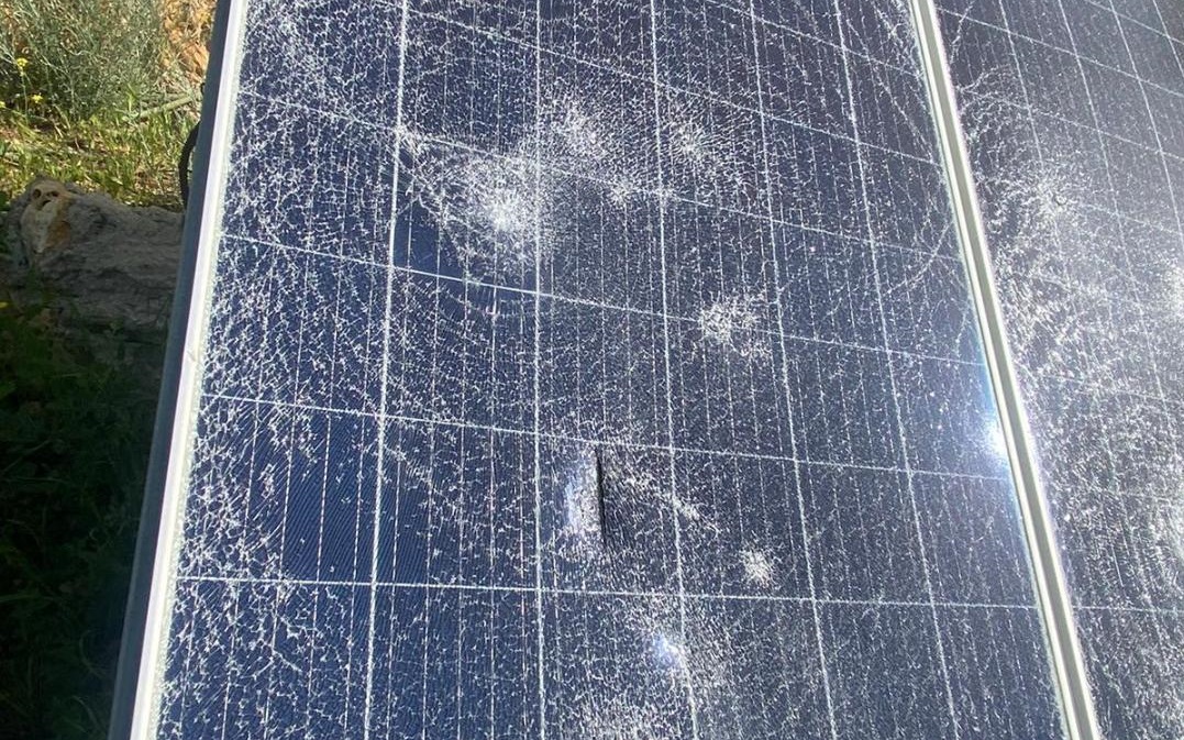 بيت لحم 31-3-2024 وفا- حطم مستعمرون، اليوم الأحد، ألواح طاقة شمسية ومحتويات غرفة زراعية، في منطقة خلة النحلة قرب قرية وادي رحال، جنوب بيت لحم.
