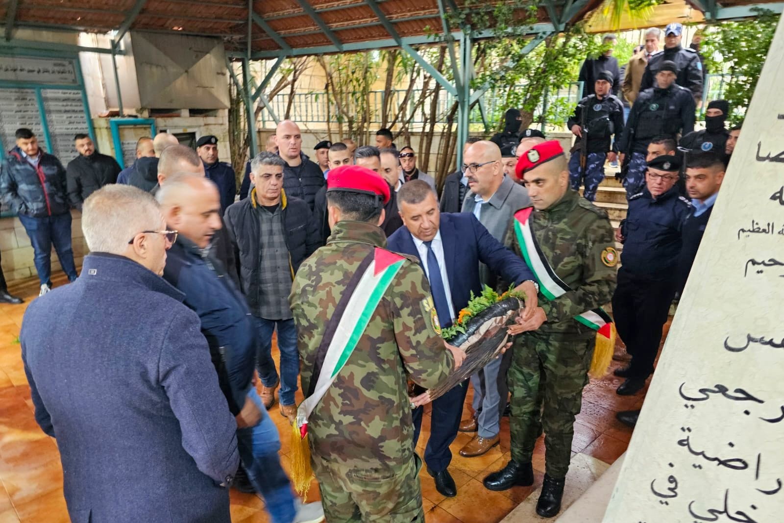 الخليل 10-4-2024 وفا- وضع محافظ الخليل خالد دودين، اليوم الأربعاء، يرافقه قادة الأجهزة الأمنية وعدد من الشخصيات الاعتبارية في المحافظة، ووفدا من المحافظة، إكليلا من الزهور على ضريح الشهداء بمدينة الخليل، بمناسبة عيد الفطر المبارك.
