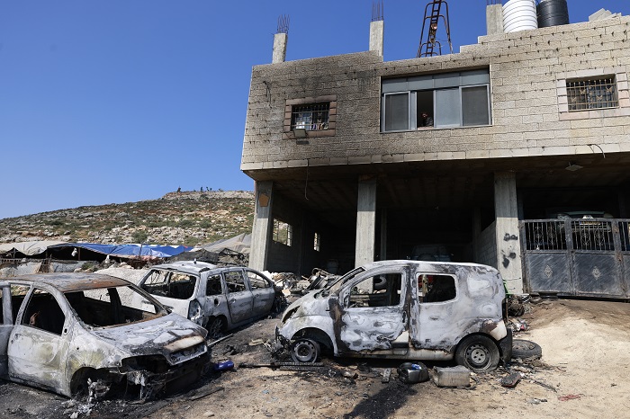 رام الله 13-4-2024 وفا- أحرق مستعمرون، مساء اليوم السبت، عددا من منازل المواطنين ومركباتهم في قرية المغيّر شمال شرق رام الله.