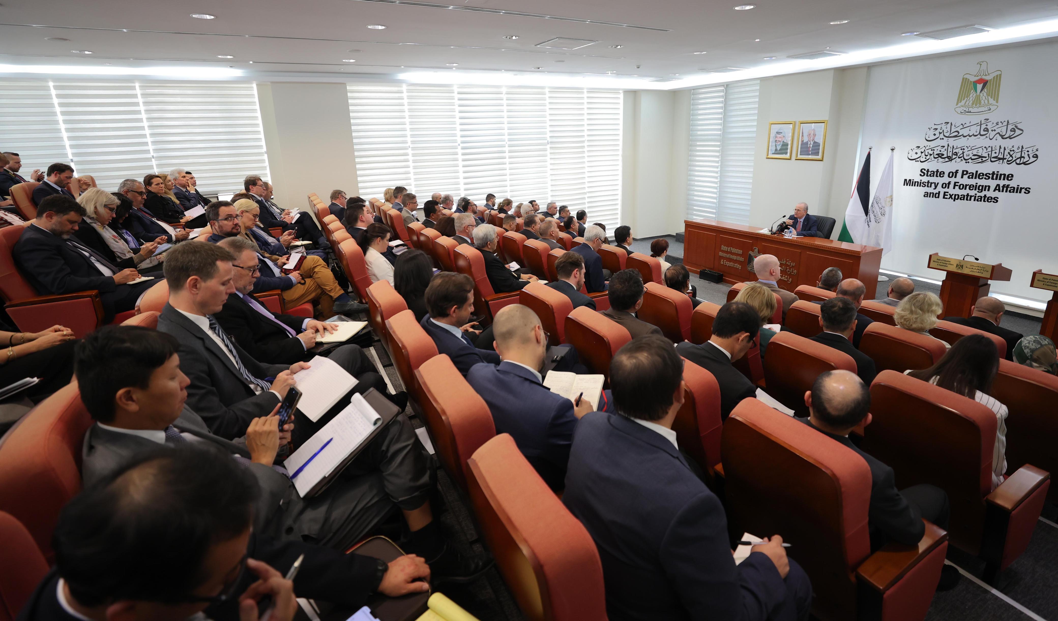 جاء ذلك خلال لقائه أكثر من خمسين من أعضاء السلك الدبلوماسي المعتمد لدى دولة فلسطين وممثلي منظمات ومؤسسات دولية، اليوم الاثنين، في مقر وزارة الخارجية برام الله، حيث أطلعهم على خطورة استمرار اعتداءات المستوطنين وسياسات الاحتلال في الضفة الغربية بما فيها القدس، وقطاع غزة.