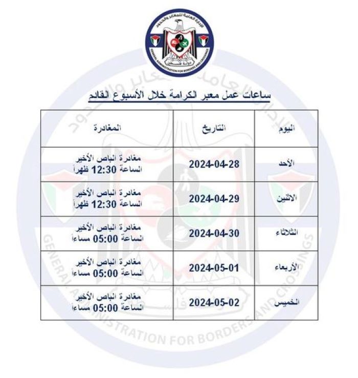 أريحا 25-4-2024 وفا- أعلنت الإدارة العامة للمعابر والحدود، عن تعديل ساعات العمل على معبر الكرامة للأسبوع المقبل، وإغلاقه أمام المسافرين يوم السبت 27 نيسان/ ابريل.
