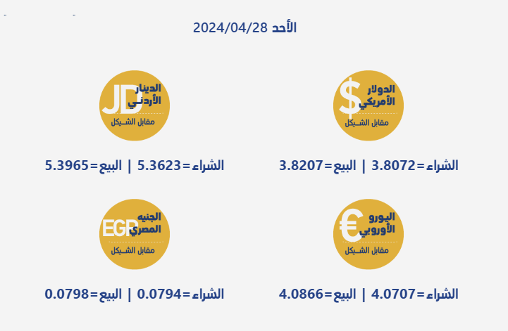رام الله 28-4-2024 وفا- جاءت أسعار صرف العملات مقابل الشيقل الإسرائيلي، اليوم الأحد، بحسب سلطة النقد الفلسطينية، على النحو التالي: