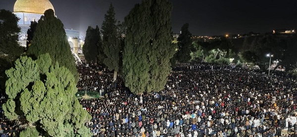 القدس 5-4-2024 وفا- أدى 200 ألف مصلٍّ صلاتي العشاء والتراويح في ليلة السابع والعشرين من رمضان في المسجد الأقصى المبارك، متجاوزين اجراءات الاحتلال وقيوده وعراقيله.
