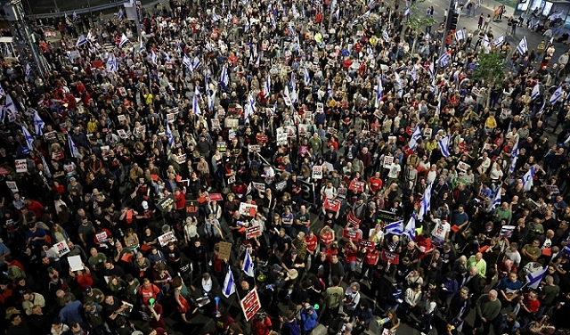 تل أبيب 7-4-2024 وفا- تظاهر عشرات الآلاف مساء السبت، في تل أبيب وأكثر من 50 موقعا وبلدة أخرى ضد الحكومة الإسرائيلية وللمطالبة بإجراء انتخابات بشكل فوري، اصيب واعتقل خلالها العديد من الاسرائيليين.